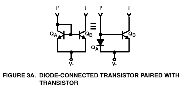 Figure 3A shows a simple current mirror. Let us assume that V- is connected to ground, and that a resistor is connected from +12 to the collector of QA. The collector of QA is connected to the base, so that there is just a diode drop from collector to emitter. The base voltage adjusts itself so that the sum of the base current and the collector current (beta times the base) is equal to the current defined by the resistor. Let us assume that the diode drop is .6 volts. Thus, the voltage across the resistor is about 11.4 volts, and we can select the value of resistor to give us whatever current we like. Since the transistors are monolithic and matched, whatever collector current VBE of QA defines, the same collector current will flow in QB, which sees the same VBE. Since transistor QA acts like a diode, it is typically shown as a diode, as the right side of Figure 3A. shows.