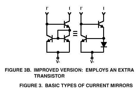 Thus, for the current mirror, current is ‘pushed’ from above (I called it ‘blown’) into the diode, and a very nearly equal current is "pulled" to a low voltage, (I call it ‘sucked’). The current I’ is slightly larger than I since it must also provide base current for both transistors. If beta were 100, one part in 100 would go to each base for an error of about 2%. The accuracy of the mirror can be enhanced significantly by using a more complex mirror, which uses a third transistor. The math for the improved mirror appears in an early RCA linear application book, which I can’t locate for the moment. The improved mirror is shown in Figure 3B. Most monolithic current mirrors use the improved circuit. To summarize, we ‘blow’ into an NPN current mirror from above, and the output sucks an equal current from below. Note, no resistors are required to make a current mirror. By using PNP transistors, we can make a current mirror in which we ‘suck’ current from below and the mirror ‘blows’ an equal current from above. We are now ready to look at the OTA.