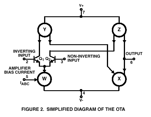 In the late sixties, RCA, then one of the major leaders in linear semiconductors, came out with the Operational Transconductance Amplifier, hereafter called OTA. The name means essentially a controllable resistance amplifier. The control input is a current. Like an operational amplifier, there are differential inputs. These inputs are used to modulate the control current. Unlike an op amp, the output of the OTA is a current! Unlike an op amp, there is not a single resistor in the OTA circuit.
