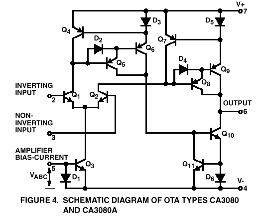 Figure 4. shows a schematic of a CA3080-style OTA. Note that all diodes shown are really diode connected transistors as in Fig. 3A. Note also that the two PNP mirrors are somewhat more complex than the NPN mirrors. This is because it is more difficult to make high gain PNP transistors on the same substrate with NPN, and a Darlington PNP is required. Again, note that no resistors are required.