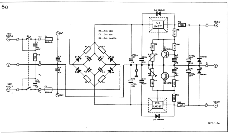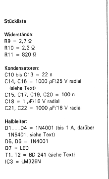 Description of the LM317 designThe dual tracking regulator LM325 yields a current of 100mA without additional transistors, in this circuit (with add. transistors) the maximum output current is 250mA. For higher currents, use heatsink and adjust R9 = 0.68 V/I(max) and R8 = 0.58 V/I(max). use 2N3055 above 1A!