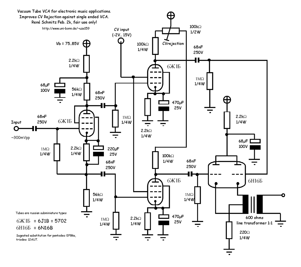 First of all, this circuit has a very pleasurable distortion. It can be nicely overdriven and it gives the sound something "guitar-ampish". When smaller (less 300-400 mV) amplitudes are applied the circuit is very linear. Gain is about 20 with a 10V control signal. Control feedthru can be minimized, but this minimum is still more than for a good semiconductor VCA. I haven't done extensive measurements, but I estimate it to be about what an untrimmed CA3080 VCA will show. But still a lot better than a single ended circuit alone. The circuit can be easily interfaced to usual envelelope generators, if you shift the signal down by about 2 Volts. I found that the RC decoupling networks are absolutely necessary because otherwise the circuit oscillates at subaudio rates ("Motorboating"). I power the circuit with about 75 volts. The PSU is made out of standard parts, a 2x30V transformer, both secondary windings put in series. This gives about 85 volts. From the PSU I've put a 1k/68µF network to the VCA. I use DC heating, the VCA is relatively quiet regarding hum. I plan to make future valve circuits operate with that powersupply. If you have higher voltages in your system, its always possible to divide them down, or use zeners, neon lamps etc.